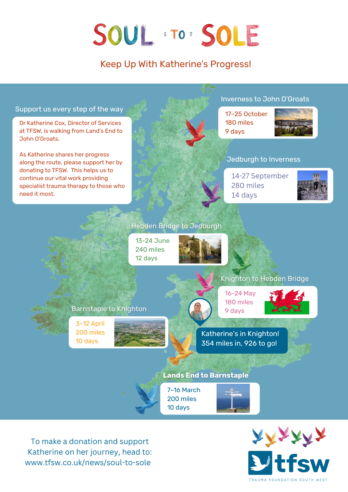 Between March and October, Dr Katherine Cox, Trauma Foundation South West’s Director of Services, will be walking from Land’s End to John O’Groats – approximately 1,280 miles. As she walks, she will be encouraging donations, aiming to raise £5,000 to support our work with refugees and people seeking asylum, providing them with proactive trauma therapy.